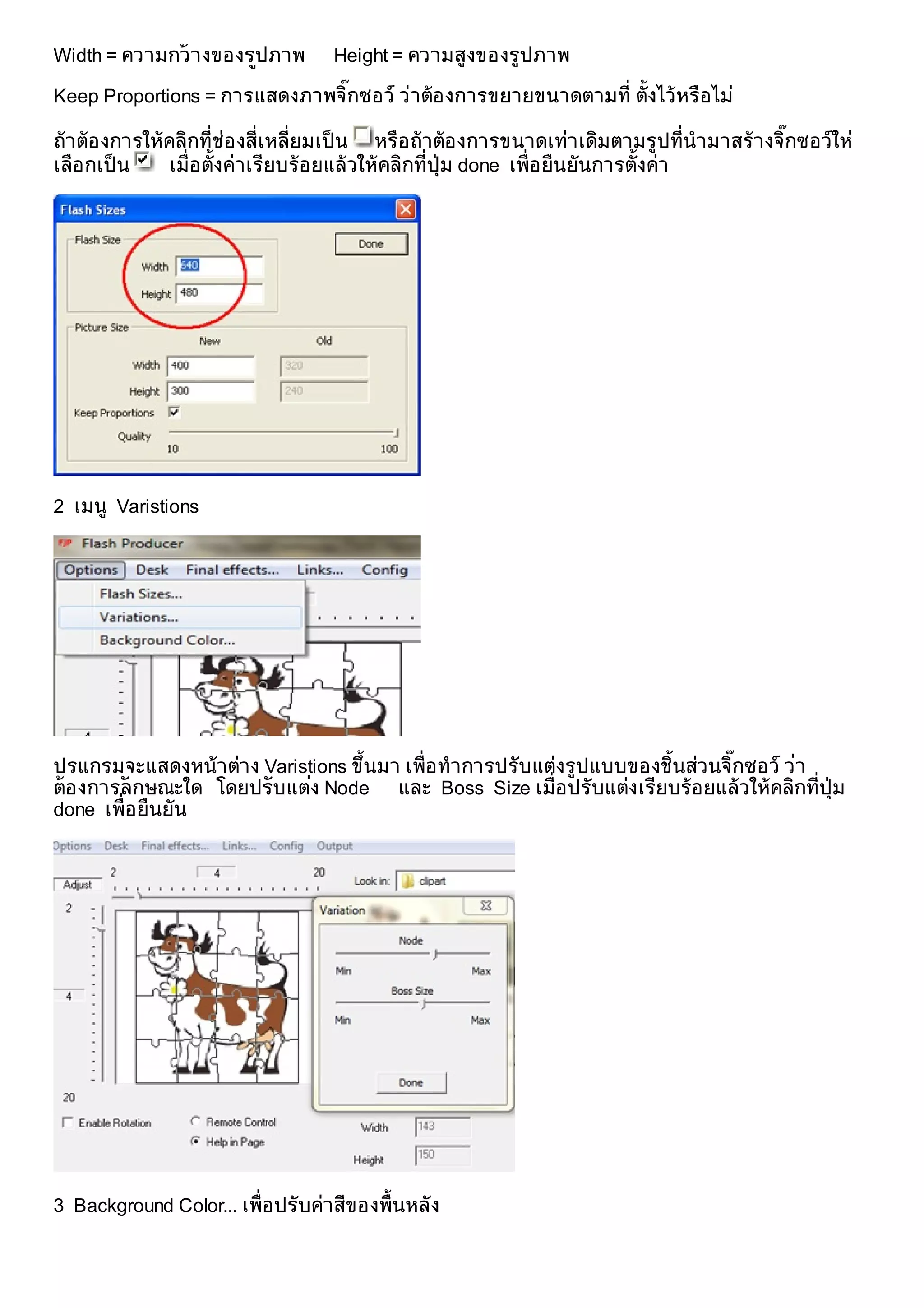 ู Height = ความสูงของรูปภาพ Keep Proportions = การแสดงภาพจิกซอว วาตอ งการขยายขนาดตามที่ ตั้งไวหรือ ไม ๊ ถาตอ งการใหคลิกที่ชอ งสี่เหลี่ยมเป็ น หรือ ถาตอ งการขนาดเทาเดิมตามรูปที่นํามาสรางจิกซอวให ๊ เลือ กเป็ น เมื่อ ตั้งคาเรียบรอ ยแลวใหคลิกที่ปุม done เพื่อ ยืนยันการตั้งคา 2 เมนู Varistions ปรแกรมจะแสดงหนาตาง Varistions ขึนมา เพื่อ ทําการปรับแตงรูปแบบของชิ้นสวนจิกซอว วา ้ ๊ ตอ งการลักษณะใด โดยปรับแตง Node และ Boss Size เมื่อ ปรับแตงเรียบรอ ยแลวใหคลิกที่ปุม done เพื่อ ยืนยัน 3 Background Color... เพื่อ ปรับคาสีข องพื้นหลัง