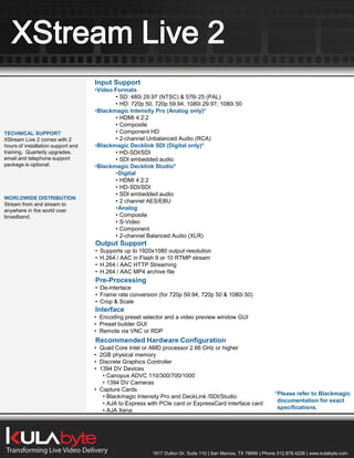 XStream Live 2 is a live video encoding and streaming software that allows users to broadcast high quality HD video at low bitrates. It supports various video formats and streaming servers. The software provides high quality H.264 encoding with proprietary technology. It is designed for live event streaming, IPTV, and other video distribution uses.