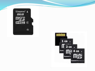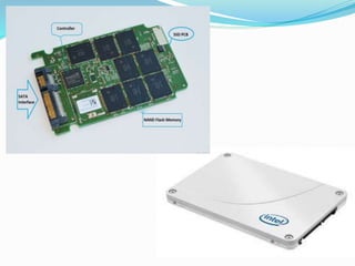 This document discusses and compares different types of flash memory storage devices: solid state drives (SSD), memory cards, and USB flash drives. It provides details on what each type is, their specifications like size and storage capacity, advantages like portability and speed, and disadvantages like cost and durability. SSDs use flash memory and have no moving parts, providing faster access and transfer times than hard disks. Memory cards are used for media transfer between devices and come in formats like SD and microSD. USB flash drives simply plug into ports for convenient portable storage.