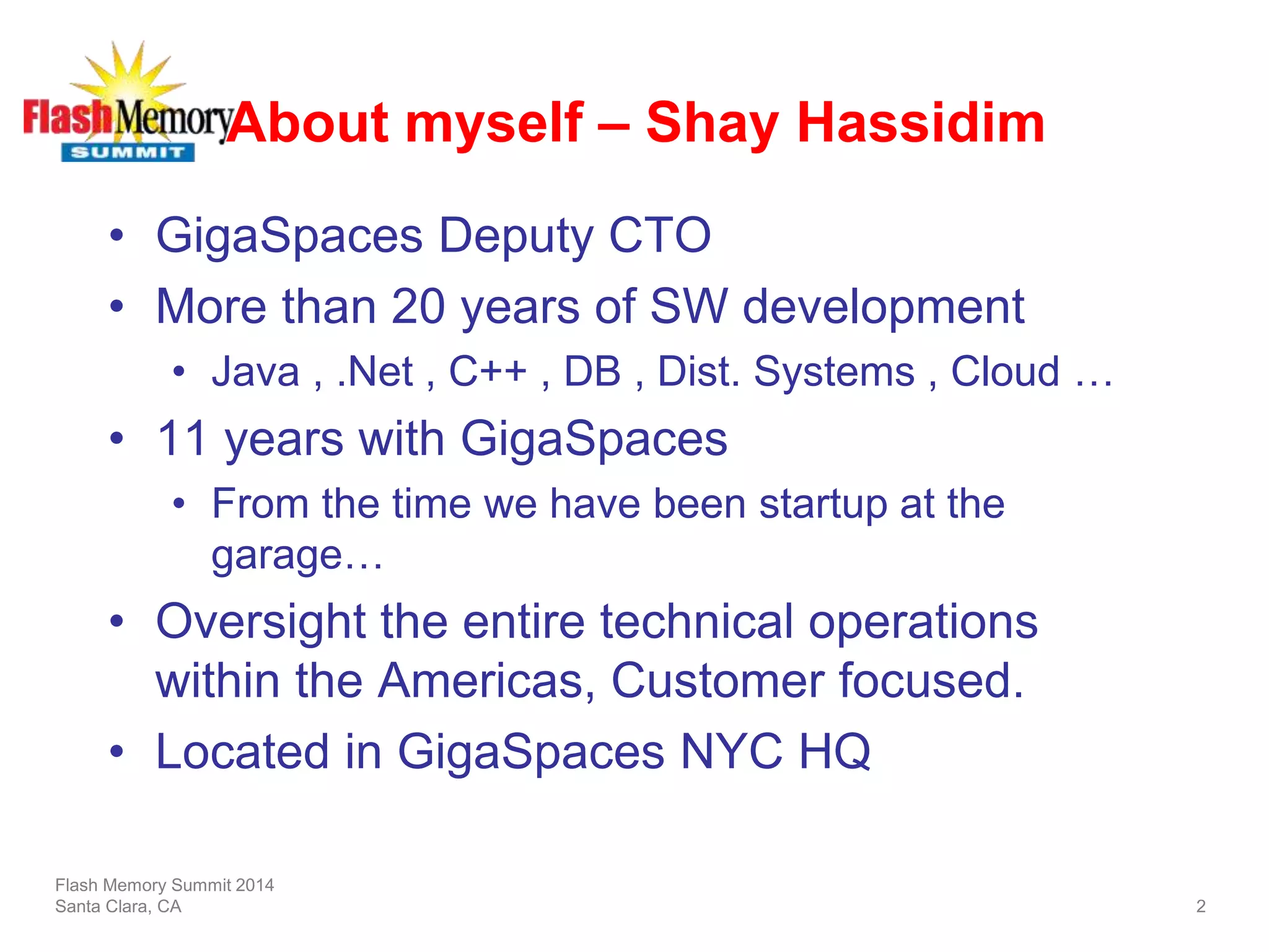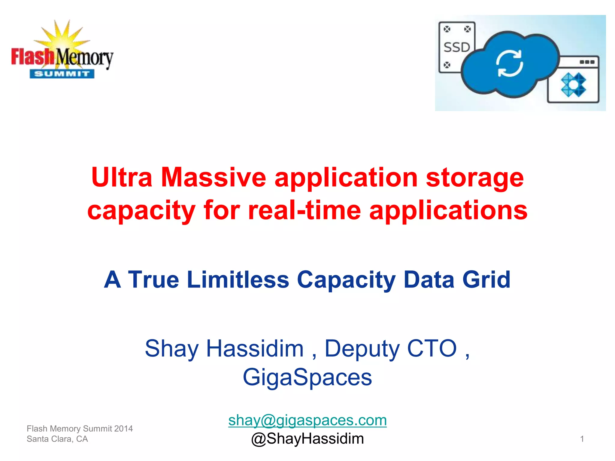 Shay Hassidim, Deputy CTO of GigaSpaces, discusses the capabilities of their ultra massive application storage solution, XAP MemoryXtend, which utilizes high-density SSD servers for managing large volumes of data efficiently. The presentation highlights the advantages of speed, scalability, and simplicity in data processing, benchmarking its performance against RAM and other data storage solutions. Key points of consideration include SSD price-performance metrics and architectural considerations for optimal usage in real-time applications.