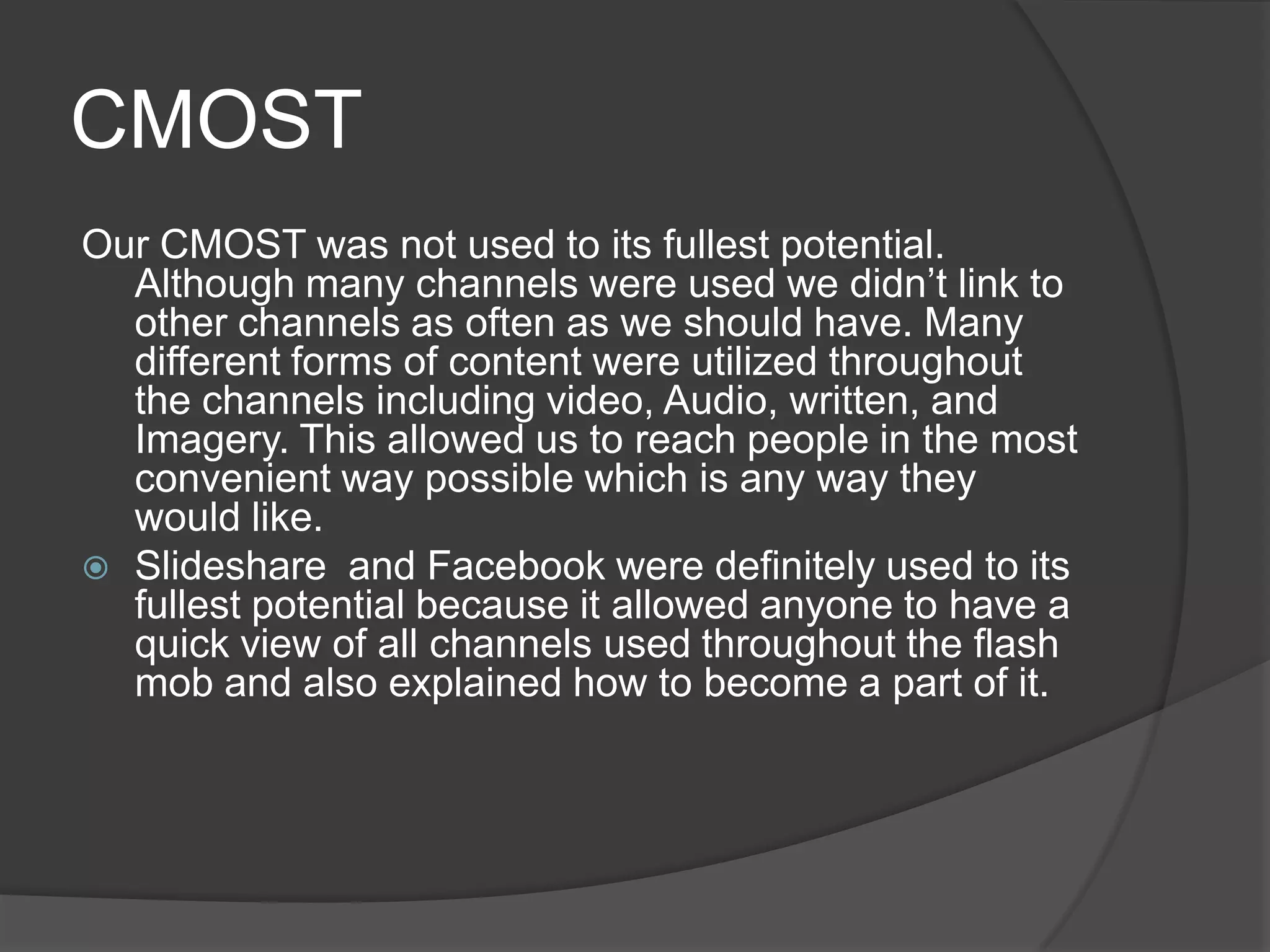 The document discusses a CMOST campaign for a chalk flash mob event that was not as successful as intended. It analyzes what social media channels worked best (Facebook, Instagram, YouTube), what channels did not work (Pinterest, Doodly), and identifies mistakes like using too many channels, not planning far enough in advance, and not securing influencers to promote the event. Recommendations include starting promotion earlier, focusing efforts on fewer dominant channels, and involving a local sports team to gain more attention.