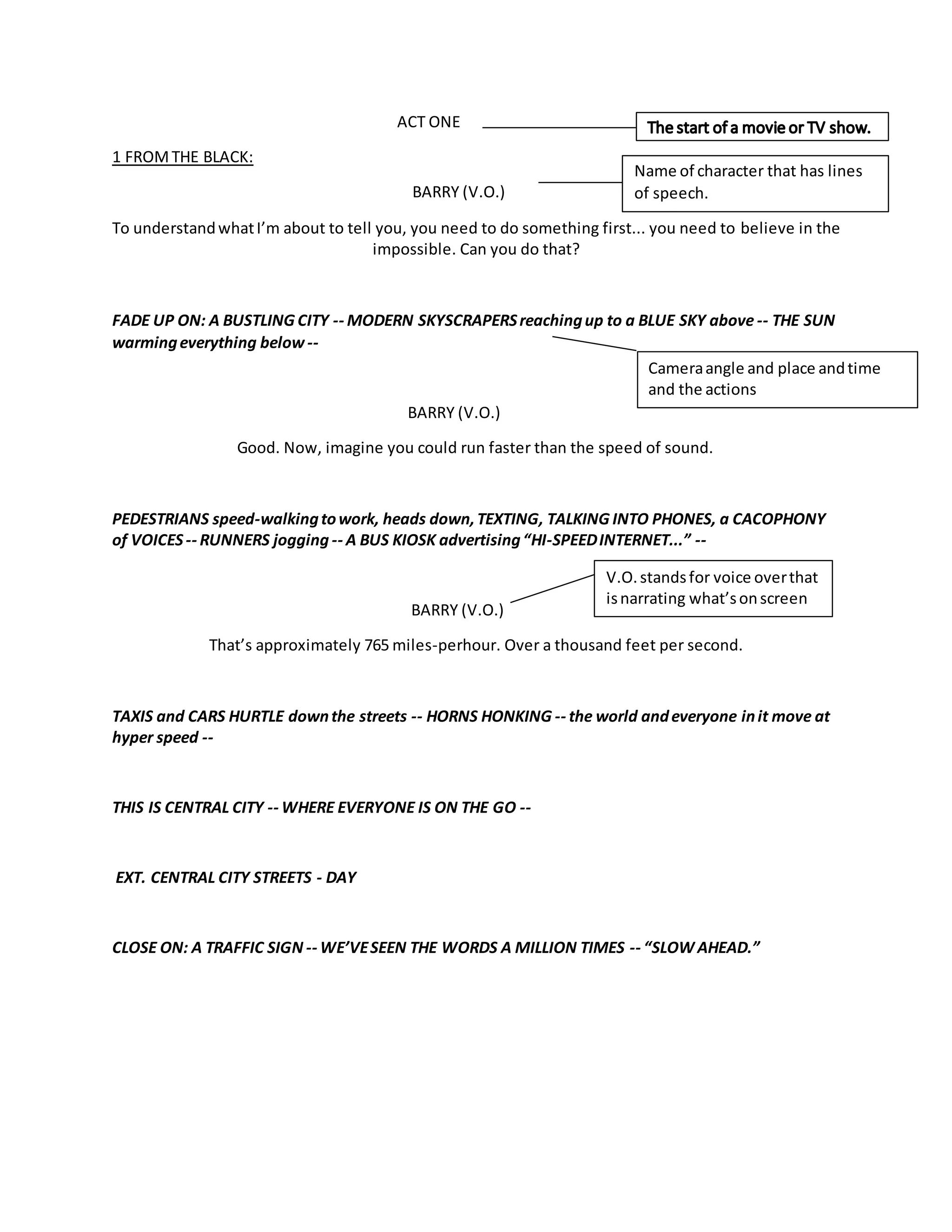 1. The narrator, Barry, asks the audience to believe in the impossible and imagine running faster than the speed of sound, which is approximately 765 miles per hour.