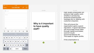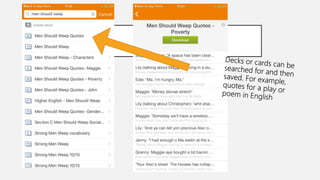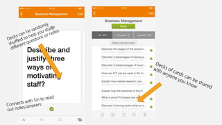 Flash cards allows users to create and share digital flashcards for studying. Key features include automatically saving decks, reading cards aloud in different languages, easily sharing decks between groups, tracking learning progress, inserting images, searching terms, shuffling cards randomly, accessing pre-made decks, and sharing by email, messaging apps, or links. Users can collaboratively build decks by sharing with groups, improving answers over time. It provides a more organized alternative to paper notes that can be accessed anywhere.