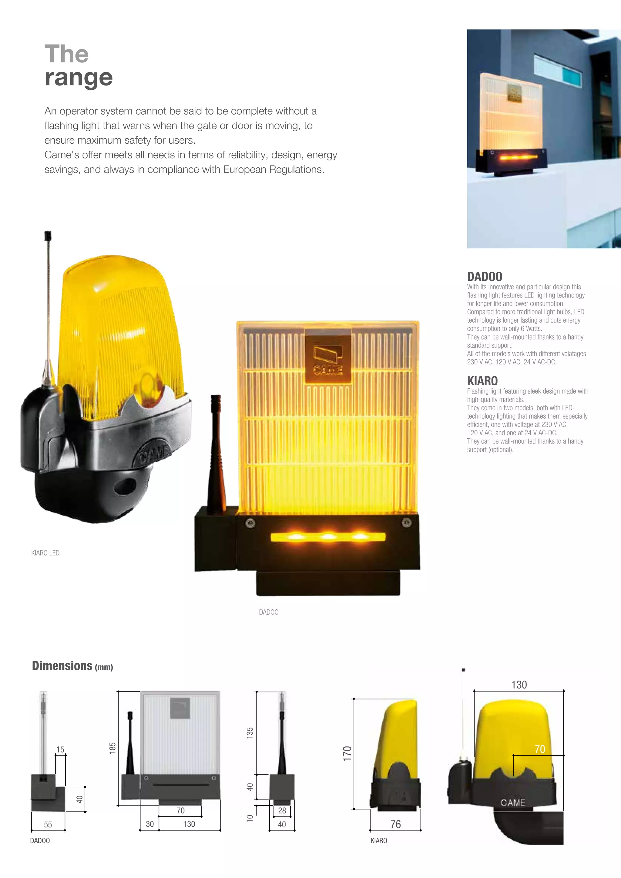 The document describes the Dadoo and Kiaro series of LED flashing lights, highlighting their energy efficiency, long lifespan, and suitability for wall mounting. Both models come in various voltages and colors, emphasizing safety for operator systems. Came S.p.A., the manufacturer, offers a wide range of automation and control solutions, fully certified and produced in Italy.
