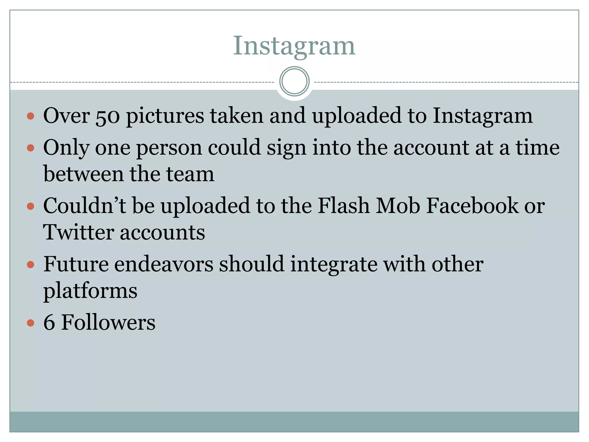 The document discusses the use of various social media platforms for promoting and documenting a flash mob event called #ChalkAboutIt. It found that Twitter and Facebook were most effective for spreading information, while platforms like Pinterest, Foursquare, and Doodle.ly had limited reach. It also noted that planning earlier and focusing content on 1-2 major channels could have improved engagement. Overall, the event was a learning experience about how to better integrate social media for a spontaneous live event.