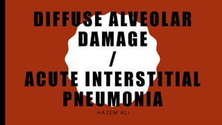 This document summarizes diffuse alveolar damage (DAD), the pathologic correlate of acute respiratory distress syndrome. DAD is characterized by diffuse pulmonary edema, hyaline membrane formation, and poor prognosis. It has many causes including infections, shock, aspiration, and toxins. Pathologically, DAD involves capillary endothelial injury, neutrophil recruitment, alveolar wall damage, and pulmonary edema. The condition progresses from an exudative to proliferative and fibrotic phase as the lungs attempt to heal. Special stains are used to identify causative organisms and assess lung recovery potential. DAD must be differentiated from other interstitial lung diseases and acute lung injury patterns.