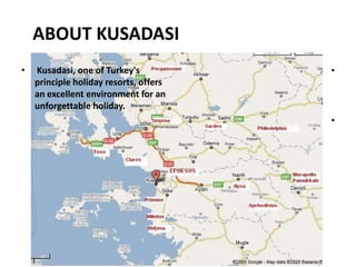 Kusadasi, a major holiday resort on Turkey's Aegean coast, is known for its beautiful beaches and proximity to historical sites like Ephesus. The city boasts a Mediterranean climate, attracting tourists with activities such as windsurfing and dining at seafood restaurants. With rapid development since the 1970s, Kusadasi offers numerous accommodations, including a large marina and a significant aqua park.