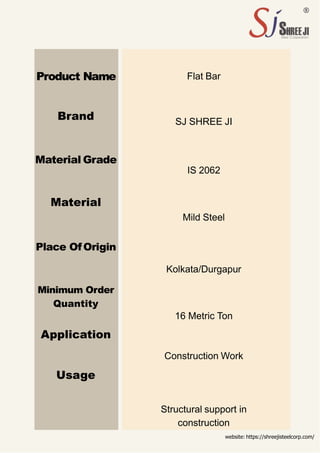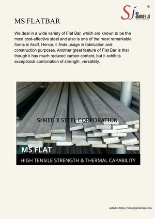 Shree Ji Steel Corporation specializes in manufacturing mild steel flat bars, recognized for their cost-effectiveness and structural strength, making them suitable for various construction and fabrication applications. The flat bars come in a wide range of sizes and weights, with detailed specifications including chemical and mechanical composition. For further information and product details, the company's website is available at https://shreejisteelcorp.com/