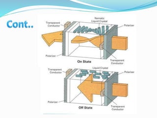 The document covers flat panel displays (FPDs), outlining their types, applications, advantages, and disadvantages compared to cathode ray tubes (CRTs). FPDs offer a thinner, lighter, and more energy-efficient alternative to CRTs, with various technologies such as emissive (plasma, LED) and non-emissive (LCD) displays. Key advantages include sharp image quality and lower power consumption, while disadvantages involve fixed pixel resolution and higher costs.
