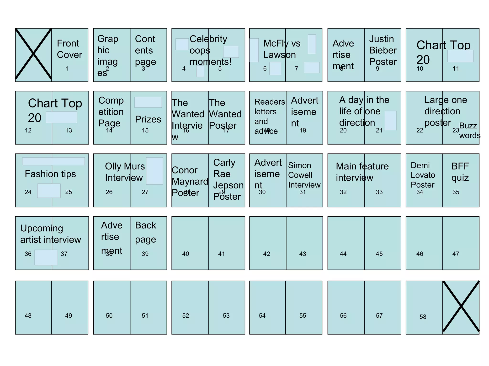 This document provides a table of contents for a magazine, listing various articles, interviews, advertisements, and other content on different pages. The table of contents includes sections on chart toppers, competitions, readers' letters, fashion tips, interviews with celebrities, and advertisements. It spans pages 1 through 58.