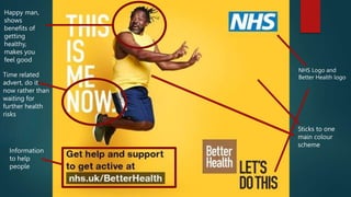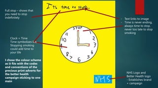 The document discusses a print advertisement for a smoking cessation campaign. It uses imagery of a clock to symbolize that it is never too late to stop smoking and potentially add time to one's life. The ad sticks to a single color scheme and includes logos of the NHS and Better Health campaign to establish its brand and message of encouraging people to quit smoking for better health.