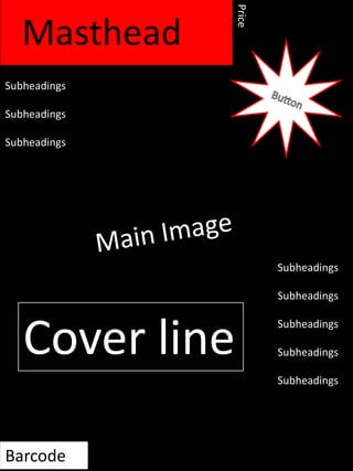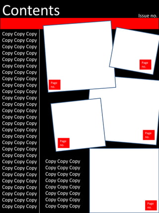 The document contains repetitive text with no other distinguishing content. It includes a masthead, subheadings, cover line, barcode, contents listing page numbers, and headings with repeated copy text blocks.