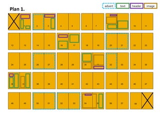 This document outlines three different plans for arranging elements on a page. Plan 1 and Plan 2 list the same sequence of numbers, likely representing various page elements. Plan 3 suggests a "flat plan" layout and again lists the same sequence of numbers as the other plans. The plans appear to be proposing different page designs that maintain the same ordered content.