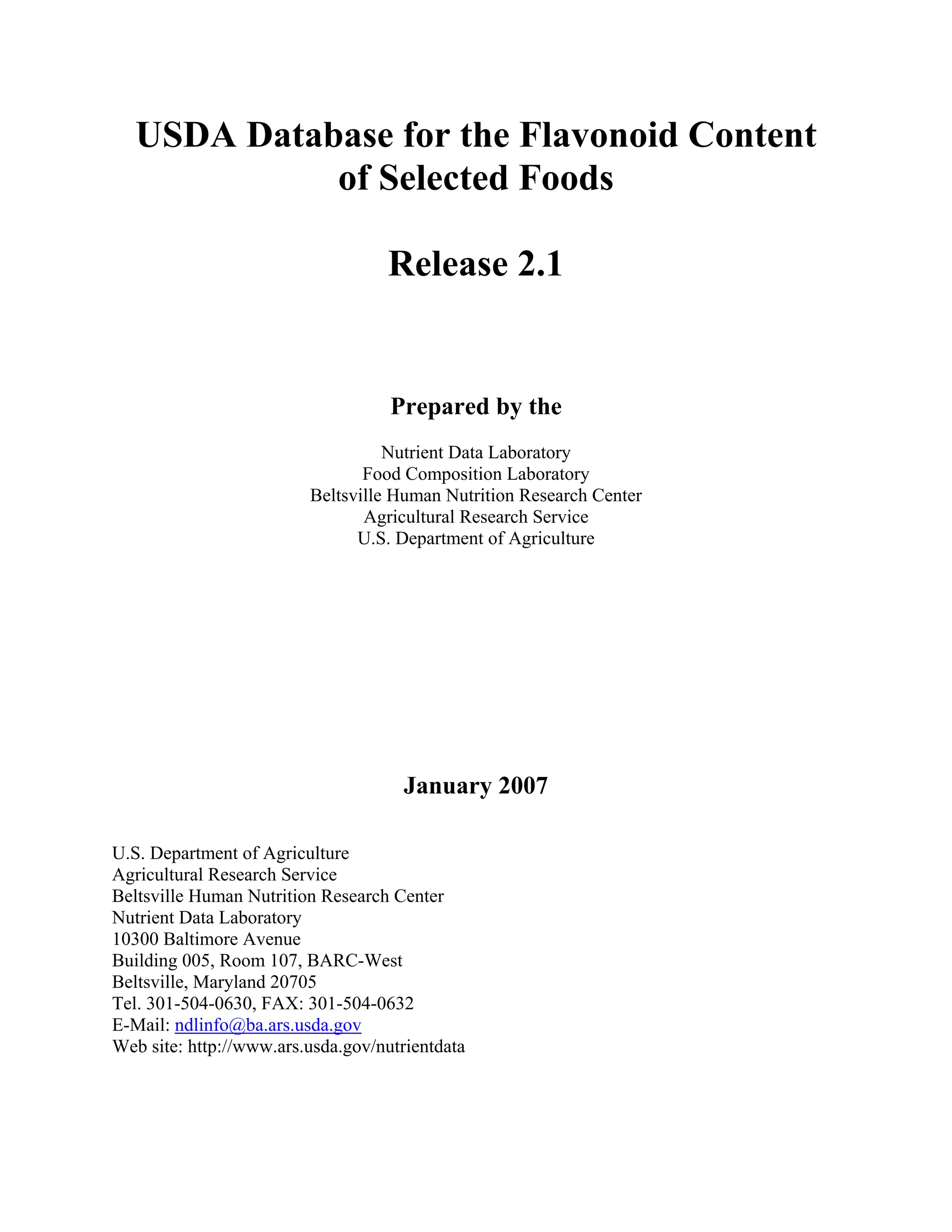 This document provides documentation for the USDA Database for Flavonoid Content of Selected Foods, Release 2.1. It summarizes the procedures used to update the database with 168 new foods and additional compounds for some existing foods. Analytical values were obtained from USDA analysis of foods as well as from literature. Values are provided for 26 common flavonoid compounds in five subclasses. The database is presented in tables listing nutritional values for flavonoids in 385 foods, and is intended to be a resource for researchers, nutritionists and consumers.