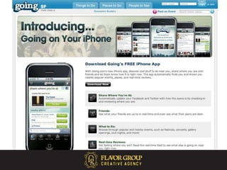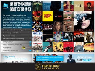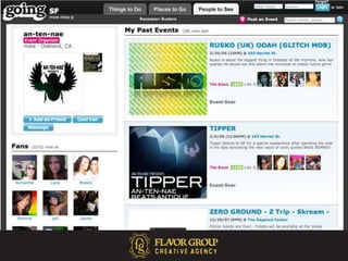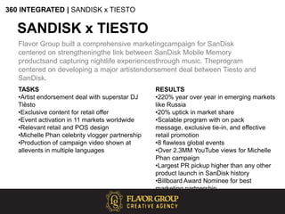 The document provides information about Flavor Group, an agency that specializes in connecting physical and digital experiences. It summarizes several case studies including launching pre-loaded microSD cards with music from major labels through a partnership with SanDisk and Walmart, organizing the Be The Riottt! music festival which gained national press coverage, and developing the Going.com website which became a popular local events guide for cities across the US. It also outlines a marketing campaign Flavor Group created for SanDisk centered around an artist partnership with DJ Tiësto, including exclusive content, worldwide events, and retail promotions that helped increase SanDisk's market share and video views.