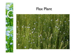 Flax fiber comes from the stem of the flax plant. The fibers form bundles beneath the bark and are long, slender cells. Flax plants grow up to 1.25 meters tall. Flax was one of the first fibers used for textiles. The production process involves cultivating the plant, harvesting, retting to separate the fibers, breaking, scutching, and hackling. Retting can be done through dam, dew, tank, or chemical methods. The fibers are then used to make products like linen, sailcloth, sewing threads, garments, artists' canvases, and composites.