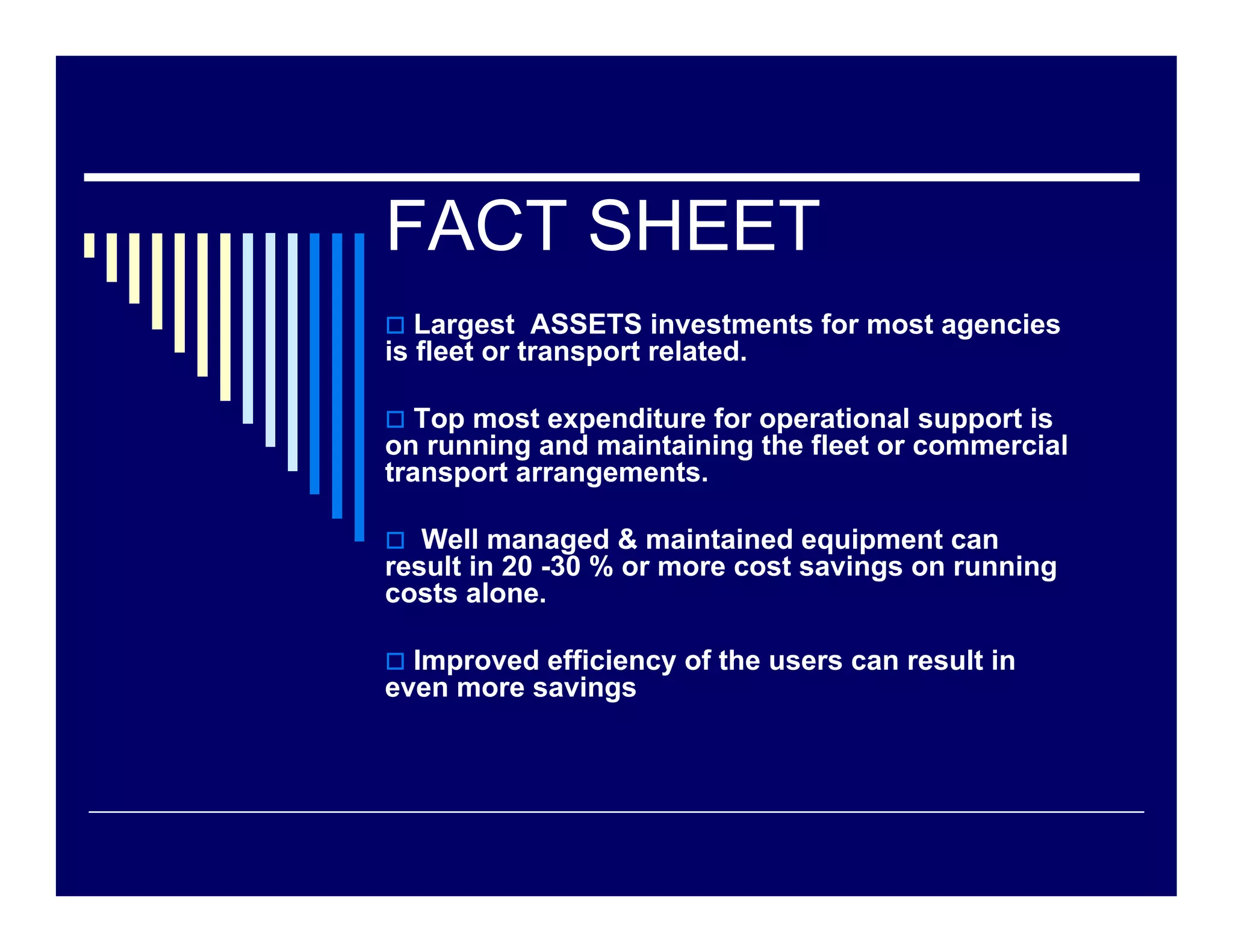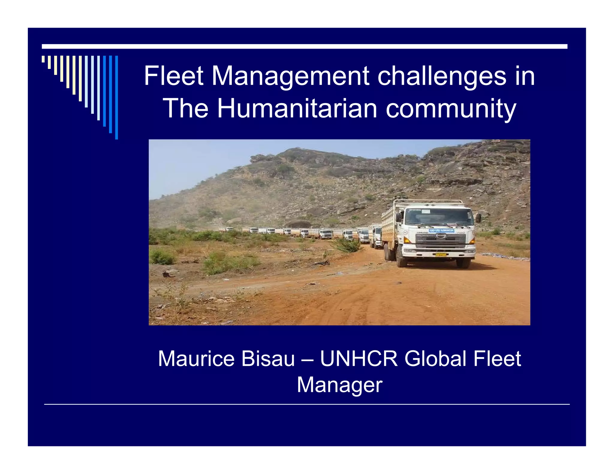 The document discusses fleet management challenges in the humanitarian community, emphasizing the importance of effective maintenance and replacement cycles to optimize costs and productivity. It recommends developing clear specifications for equipment, establishing cost tracking procedures, and fostering interagency collaboration for better fleet management. Additionally, it highlights the significance of preventative maintenance, continuous evaluation of supplier performance, and strategic decision-making in sourcing and managing fleets.