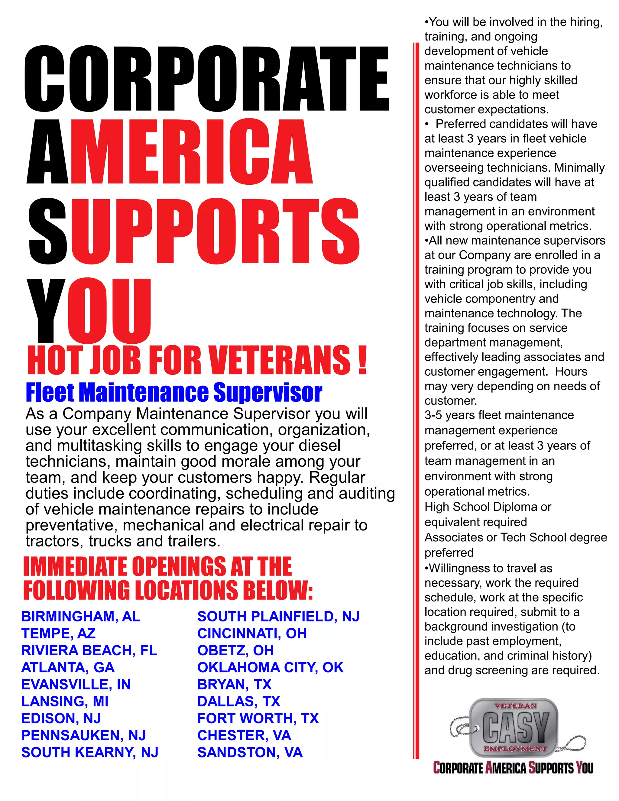 The document advertises for a Fleet Maintenance Supervisor position at multiple locations. The supervisor will oversee vehicle technicians, ensure high quality maintenance through training and development of technicians, and have at least 3 years of fleet maintenance or team management experience. The role requires excellent communication skills and involves coordinating vehicle repairs, hiring, and meeting customer expectations.