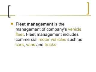 Fleet management involves overseeing a company's vehicle fleet, including functions like maintenance, financing, tracking, driver management, and safety. A fleet manager's responsibilities include vehicle repairs, replacement schedules, managing maintenance shops and crews, and communicating with users to select the appropriate fleet equipment for their needs and budget, such as cars, trucks, and graders for full-time use, and limited-use or external equipment.