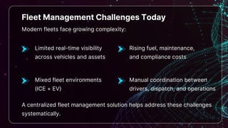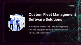 Illustrate how a sophisticated fleet management solution enables a business to take full control over operations by enabling real-time tracking, analytics, maintenance scheduling, fuel optimization, and safety monitoring. Key features, benefits, and use cases that help reduce costs while improving driver performance and simplifying logistics are laid out in this presentation on comprehensive fleet management software developed for scalability and efficiency.
