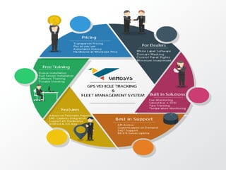 This document summarizes a fleet management system that offers route planning, geo-fencing, maintenance tracking, and reporting. It is aimed at dealers, franchises, schools, personal users, and enterprises. Key features include unlimited geo-fencing, maintenance reminders, customized solutions, and mobile apps. The system provides advantages in cost, differentiation, and competitive positioning.