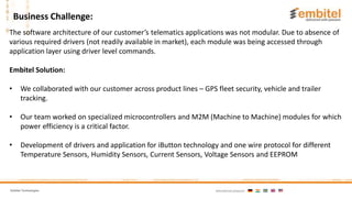 Embitel Technologies provided a customized solution for telematics applications by developing modular drivers for various GPS and radio modules, addressing the lack of readily available drivers in the market. Their innovative approach included creating specialized modules and a JGPS simulator, which led to significant time and cost savings for their customer. The drivers support both 32-bit and 16-bit microcontrollers, showcasing versatility in deployment.