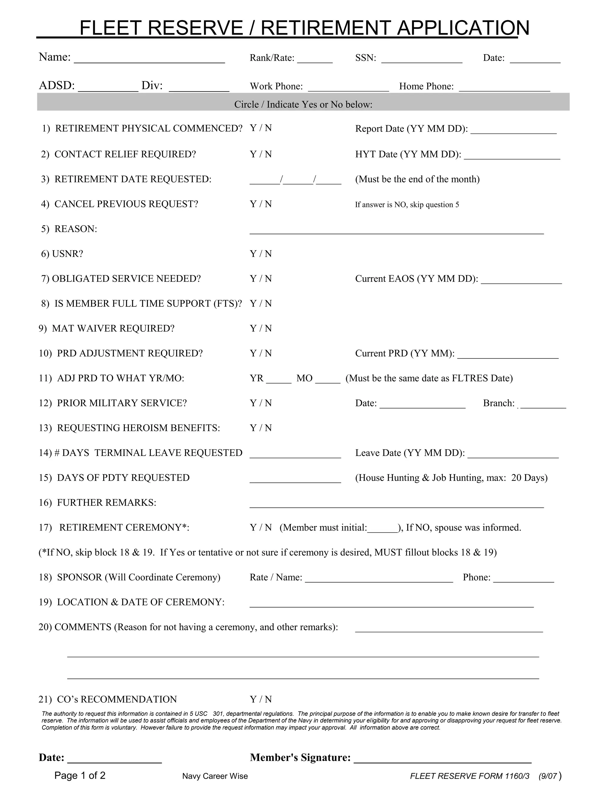 The document is a fleet reserve/retirement application containing personal information about a service member including name, rank, social security number, contact information, dates of retirement/separation, military service history, leave requests, and required approvals from supervisors, administrators and commanding officers to process the retirement request. The application requests details on the member's retirement/separation physical, retirement/separation date, prior military service, heroism benefits, terminal leave, and ceremony preferences. Supervisory sign-offs and approvals are required from division, department and command leadership.