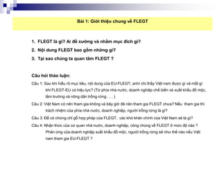 FLEGT là chương trình hành động của EU nhằm ngăn chặn buôn bán gỗ bất hợp pháp, với Việt Nam là một quốc gia quan tâm do tiềm năng xuất khẩu lớn và lợi ích từ việc tham gia vào thị trường quốc tế. Quy định FLEGT yêu cầu sản phẩm gỗ xuất khẩu phải có chứng chỉ hợp pháp từ 2010, tạo ra cơ hội và thách thức cho ngành gỗ Việt Nam. Việt Nam cần nâng cao năng lực quản lý rừng và bảo vệ môi trường để đáp ứng yêu cầu của FLEGT và khởi động chiến lược phát triển sản phẩm xanh.