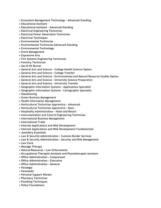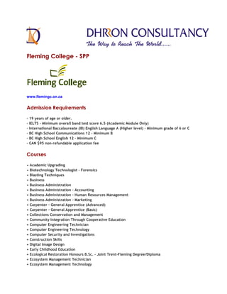 Fleming College offers a variety of programs including courses in business, engineering, environmental studies, health sciences, hospitality, and more. Admission requirements include being at least 19 years old and having a minimum IELTS score of 6.5 or meeting other specified English language requirements. Dhrron Consultancy provides services like IELTS coaching, career counseling, accommodation arrangement, and airport pickup to help students join programs at Fleming College.