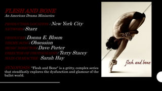 This document provides information about the American drama miniseries "Flesh and Bone" including its production details, main character, and synopsis. The opening establishes the genre as drama and mystery through dim lighting, suspenseful music, and tense visual imagery. It introduces the cast through titles over images to create mystery without showing faces. The setting is a dark studio with dim back lighting to depict a shady and depressing scenario.