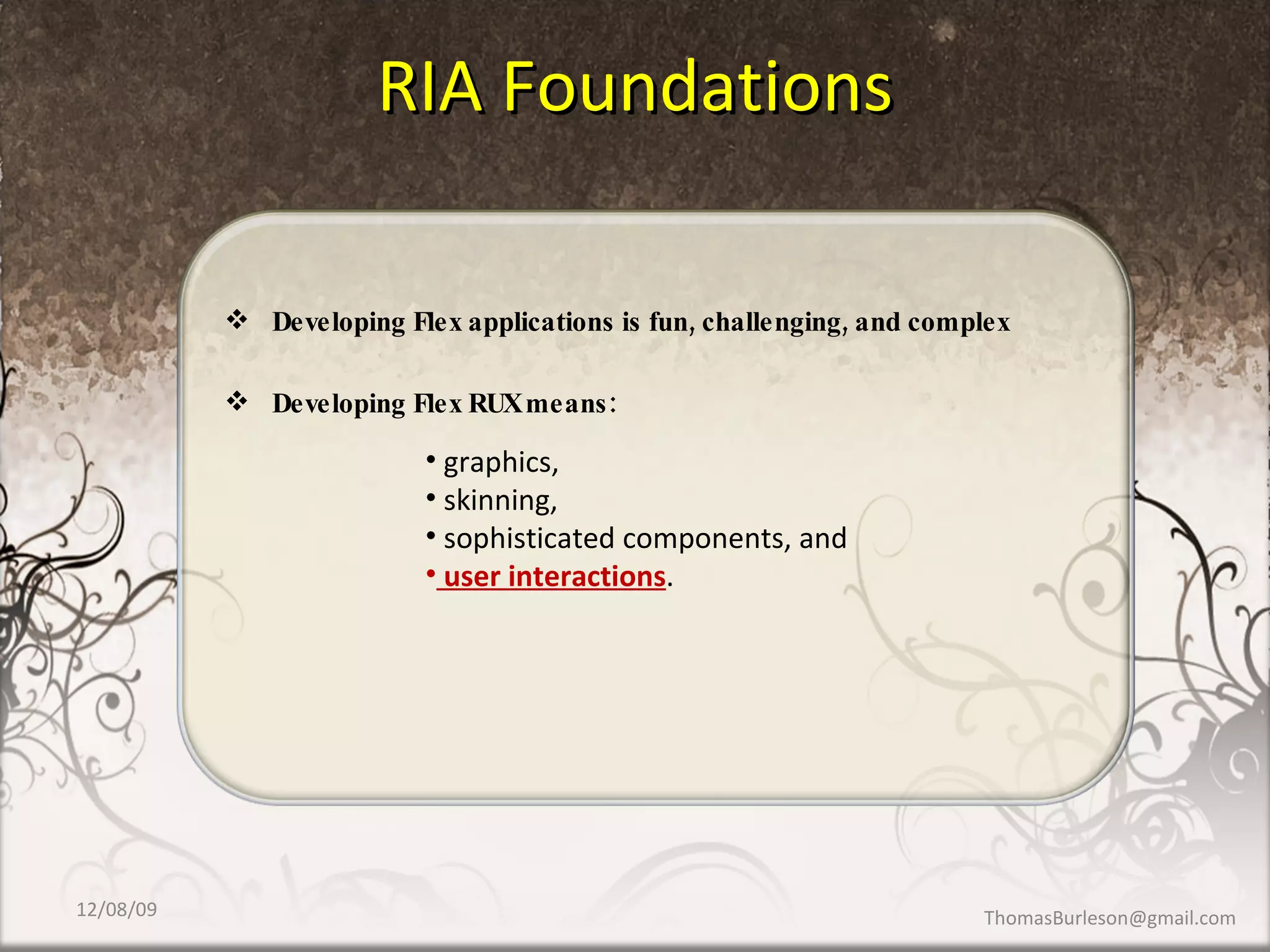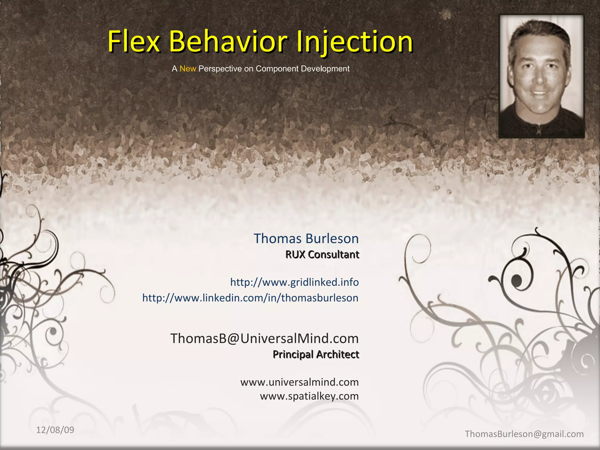 The document discusses the complexity of developing Flex applications and introduces the concept of runtime behavior injection for enhancing component functionality. It highlights traditional methods of extending functionalities, their downsides, and presents solutions that allow for reusable features like zooming and swapping in components without code modification. The use of special components that attach to targets simplifies interactions and improves reusability in Rich Internet Applications (RIAs).