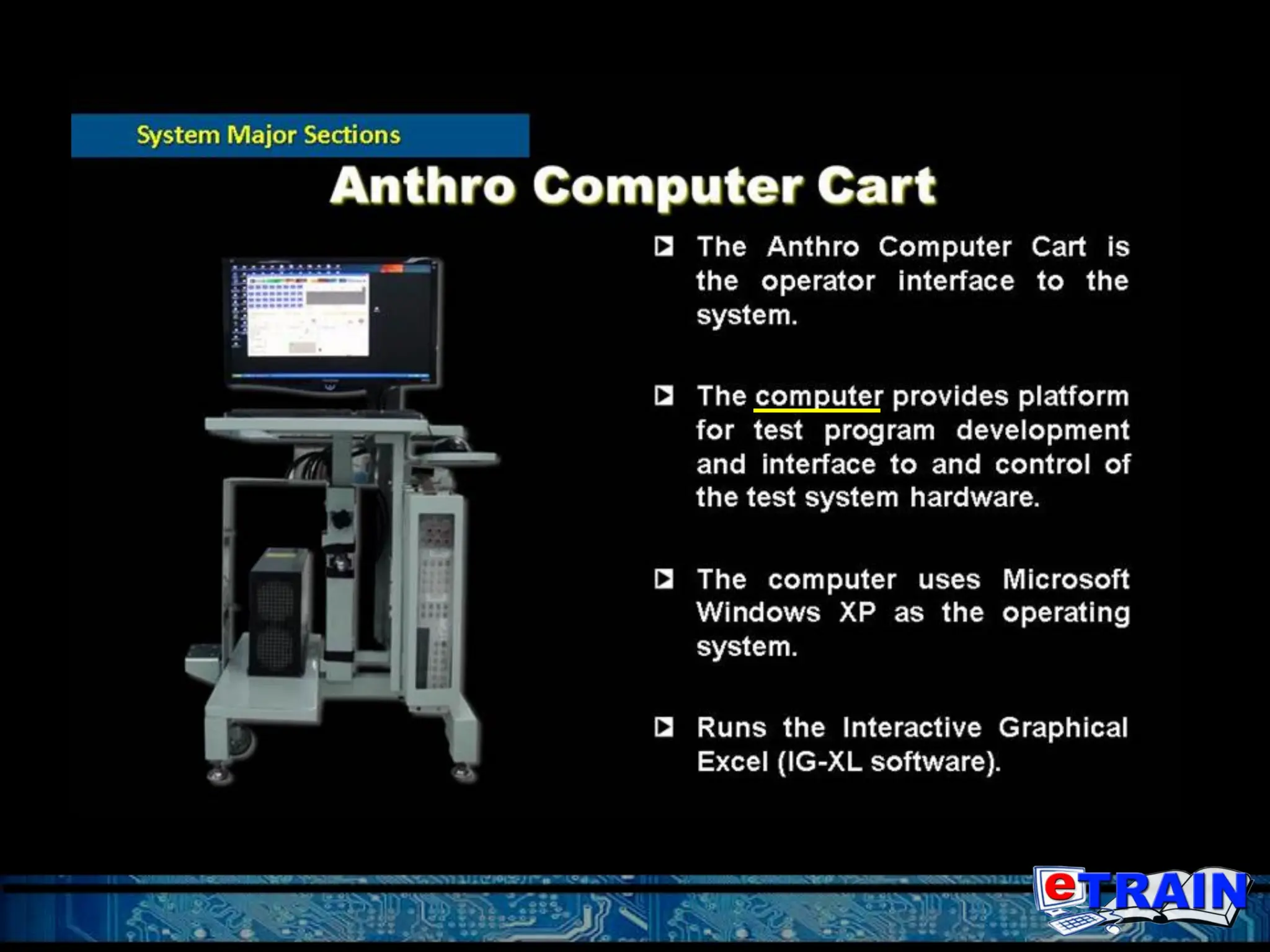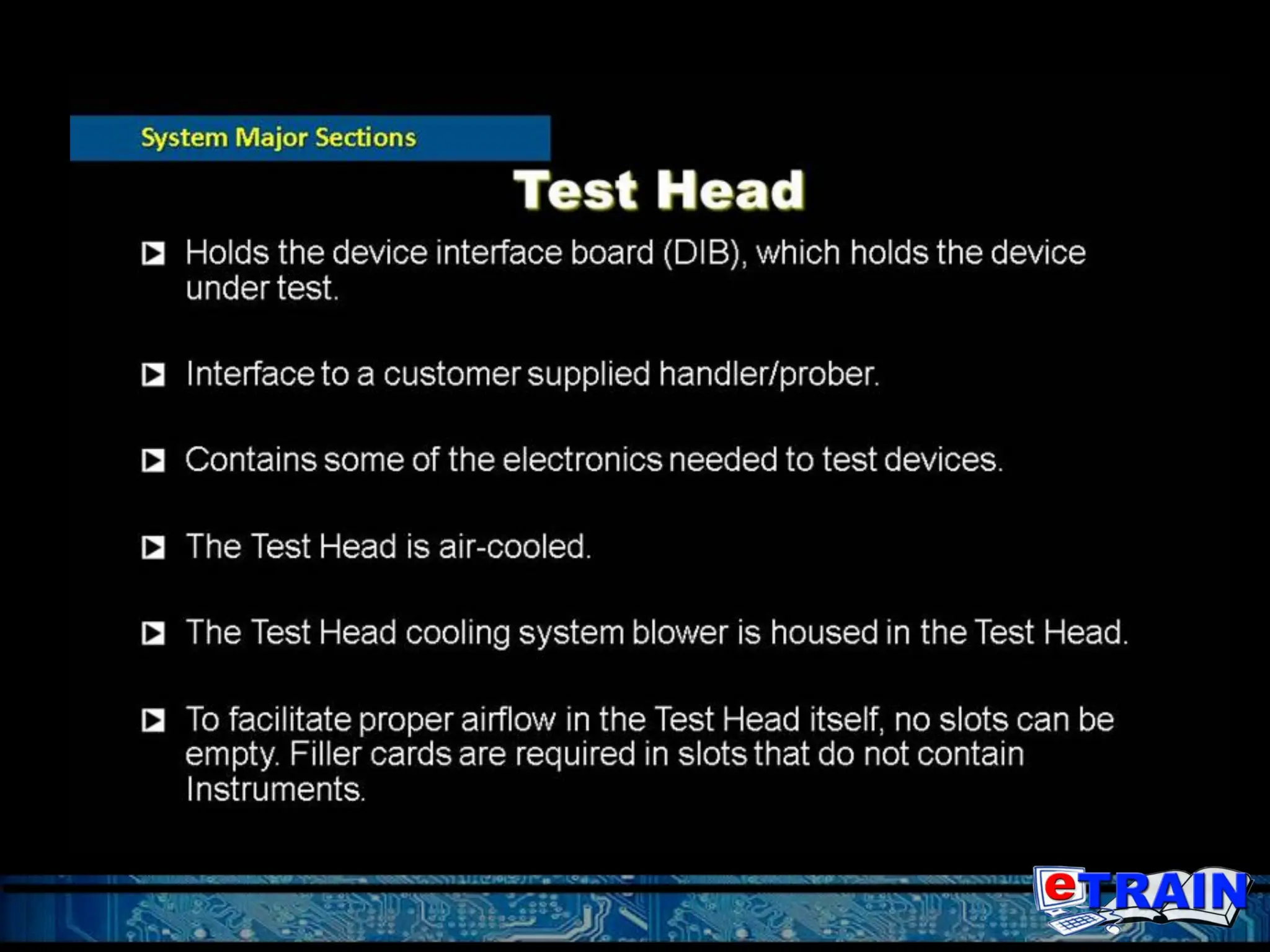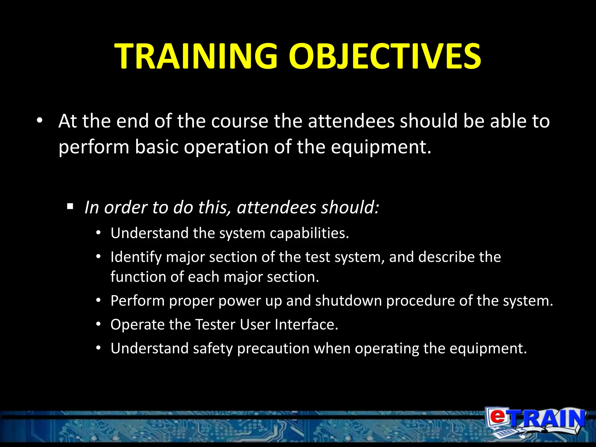 The document outlines the training objectives and operational procedures for using the Teradyne Flex test systems, including system capabilities and safety precautions. It covers topics such as power up and shutdown procedures, user interface operations, and the installation of the device interface board (DIB). Additionally, the document details the hardware components of different Flex systems (iFlex, mFlex, and uFlex) and provides step-by-step instructions for users to operate the testing equipment effectively.