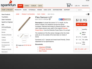 This document discusses code for reading flex sensor values and controlling LEDs based on the flex sensor reading. The code initializes an analog pin as an input to read the flex sensor values, which range from 0-24. It then uses if/else statements to light different LEDs depending on which range the flex sensor reading falls in to.