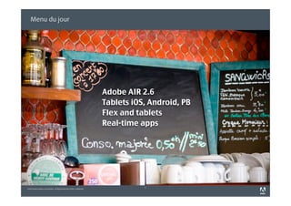This document discusses Adobe's Flash and Flex platforms on tablet devices. It covers Adobe AIR 2.6 support for iOS and Android tablets, as well as Flash Player 10.1 support. It also discusses Flex support on tablets and the new Blackberry Playbook, including its hardware specs and the Adobe AIR SDK available for developing applications for the Playbook. Finally, it discusses using LiveCycle Data Services for real-time mobile applications across multiple platforms.