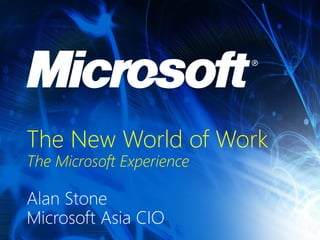 The document discusses Microsoft's experience transitioning to a New World of Work (NWoW). It describes Microsoft's large IT environment supporting over 180,000 employees. It then outlines key aspects of the NWoW, including cloud-gazers who work primarily from their desks, nomads who work anywhere, hermits who work alone, and pack-mules who spend much time meeting others. It discusses enabling the NWoW through technology, leadership, environmental changes, and benefits for employees and customers. Microsoft aims to increase productivity, collaboration, and mobility while reducing costs and environmental impact through its NWoW strategy.