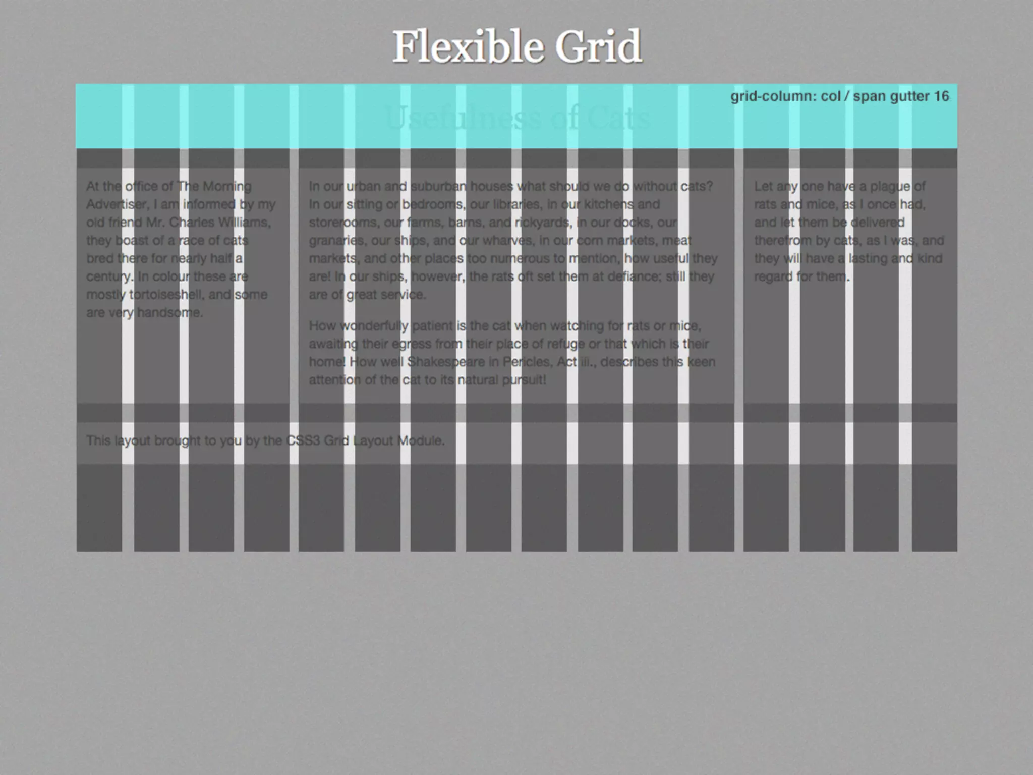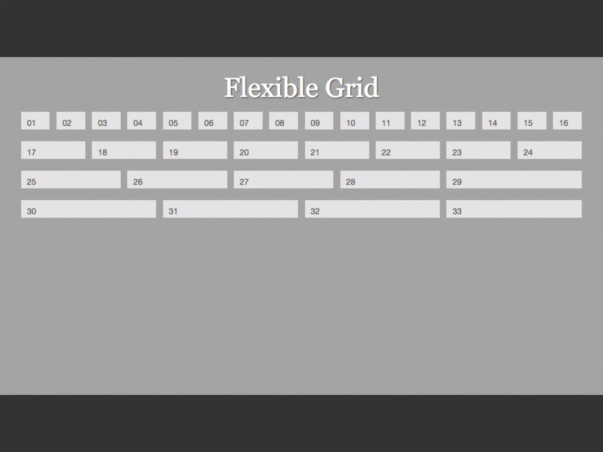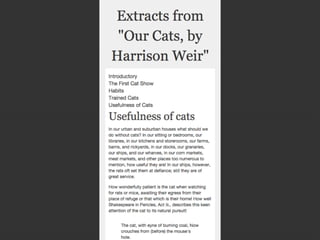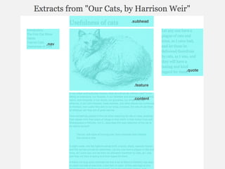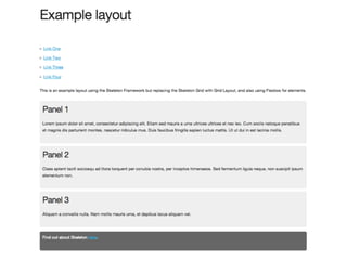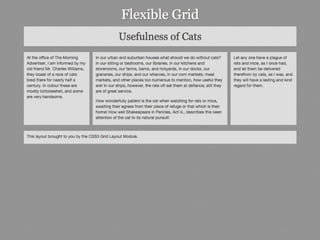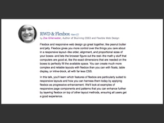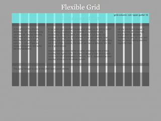 This document provides an overview and examples of CSS Grids and Flexbox layout techniques. It discusses how Flexbox allows items to be laid out in a single direction row or column, and how CSS Grids enable two-dimensional page layouts using rows and columns. Examples are given for creating navigation menus, image galleries, and multi-column page designs using these new CSS properties. Media queries are also used to redefine grid layouts at different screen sizes.