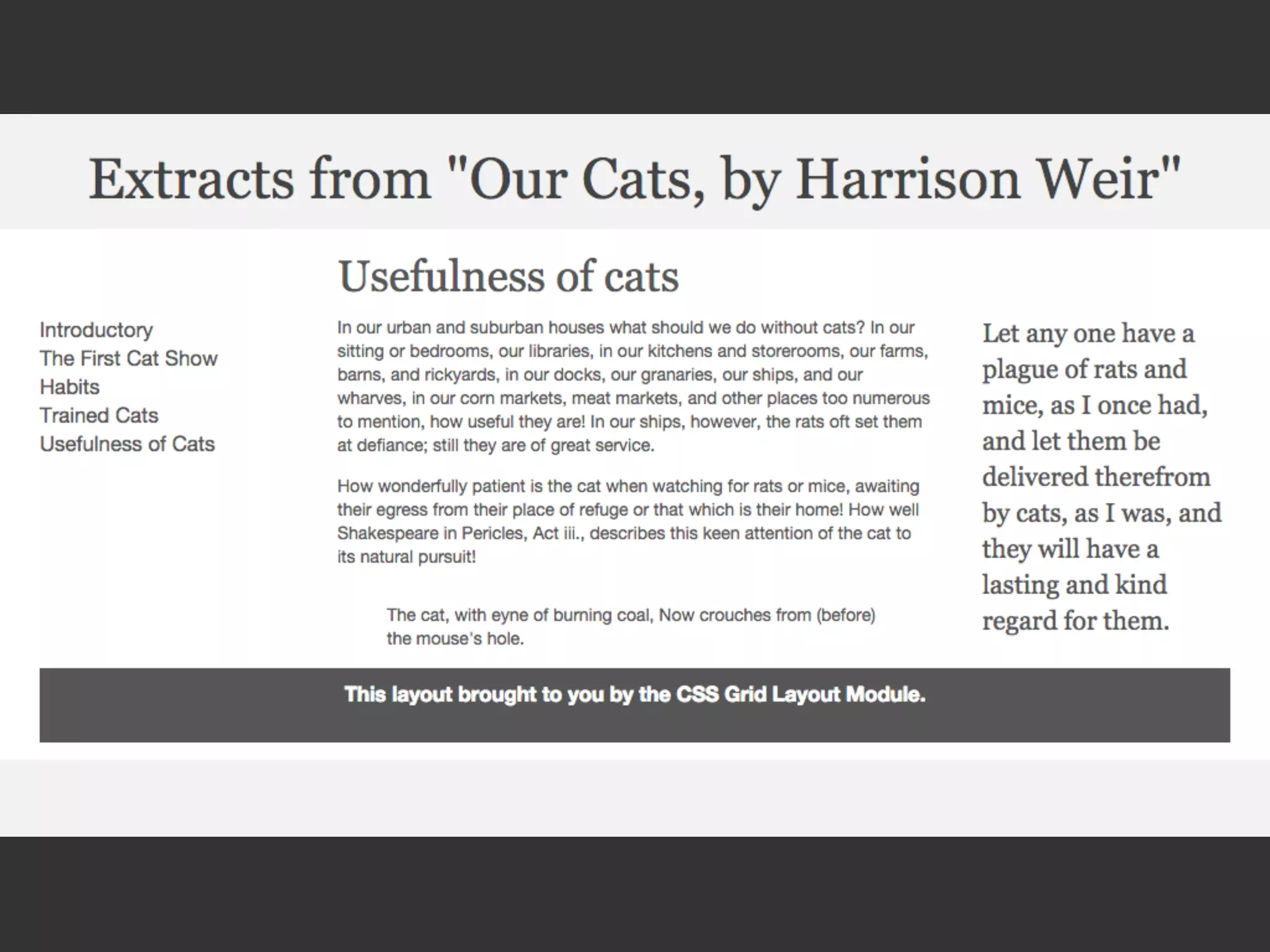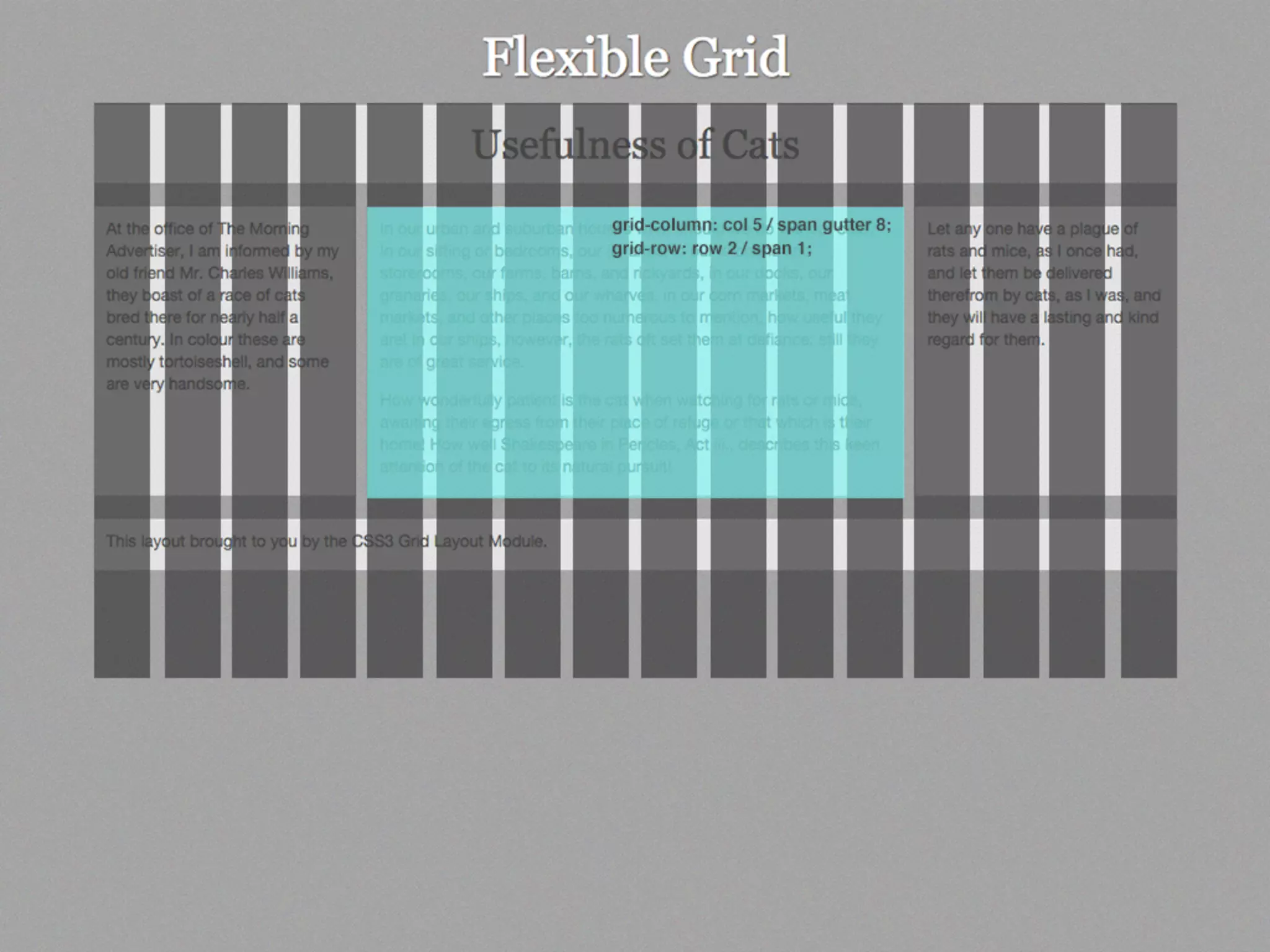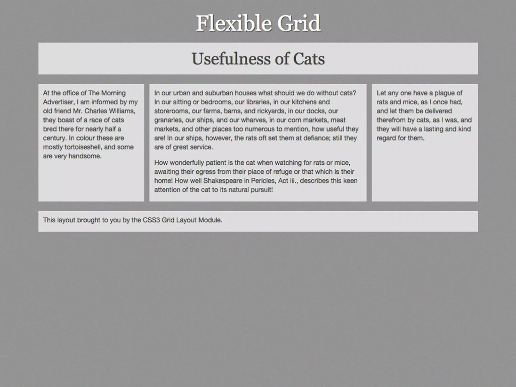 This document provides an overview and examples of CSS Grids and Flexbox layout techniques. It discusses how Flexbox allows items to be laid out in a single direction row or column, and how CSS Grids enable two-dimensional page layouts using rows and columns. Examples are given for creating navigation menus, image galleries, and multi-column page designs using these new CSS properties. Media queries are also used to redefine grid layouts at different screen sizes.