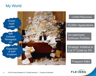 The document discusses software license optimization with FlexNet Manager Suite. It describes how FlexNet Manager Suite provides visibility into software assets, identifies entitlements and compliance positions, manages risk through prioritization and remediation, drives efficiency in usage and spend, enables agility through ITSM integration, and provides continuous software investment optimization through exception reporting and workflow automation. FlexNet Manager Suite supports more license models than any other vendor and can optimize licenses through automated identification and remediation of opportunities.
