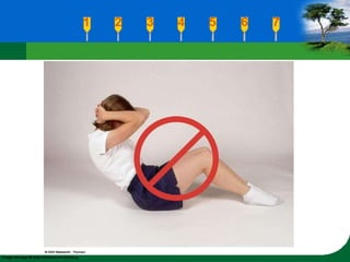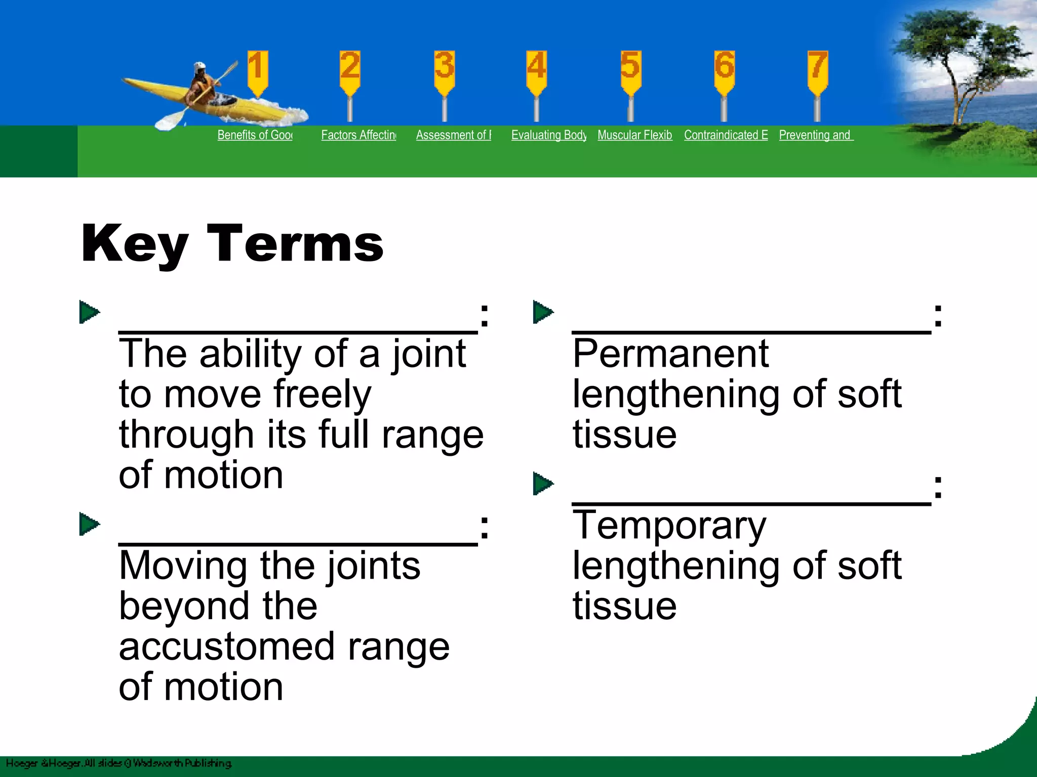 This chapter discusses the benefits of flexibility and muscular flexibility. It outlines factors that affect flexibility and different assessments that can evaluate flexibility, including the modified sit-and-reach test and shoulder rotation test. The chapter also covers guidelines for developing flexibility routines and provides tips to prevent low-back pain, such as maintaining good posture and lifting objects close to the body.