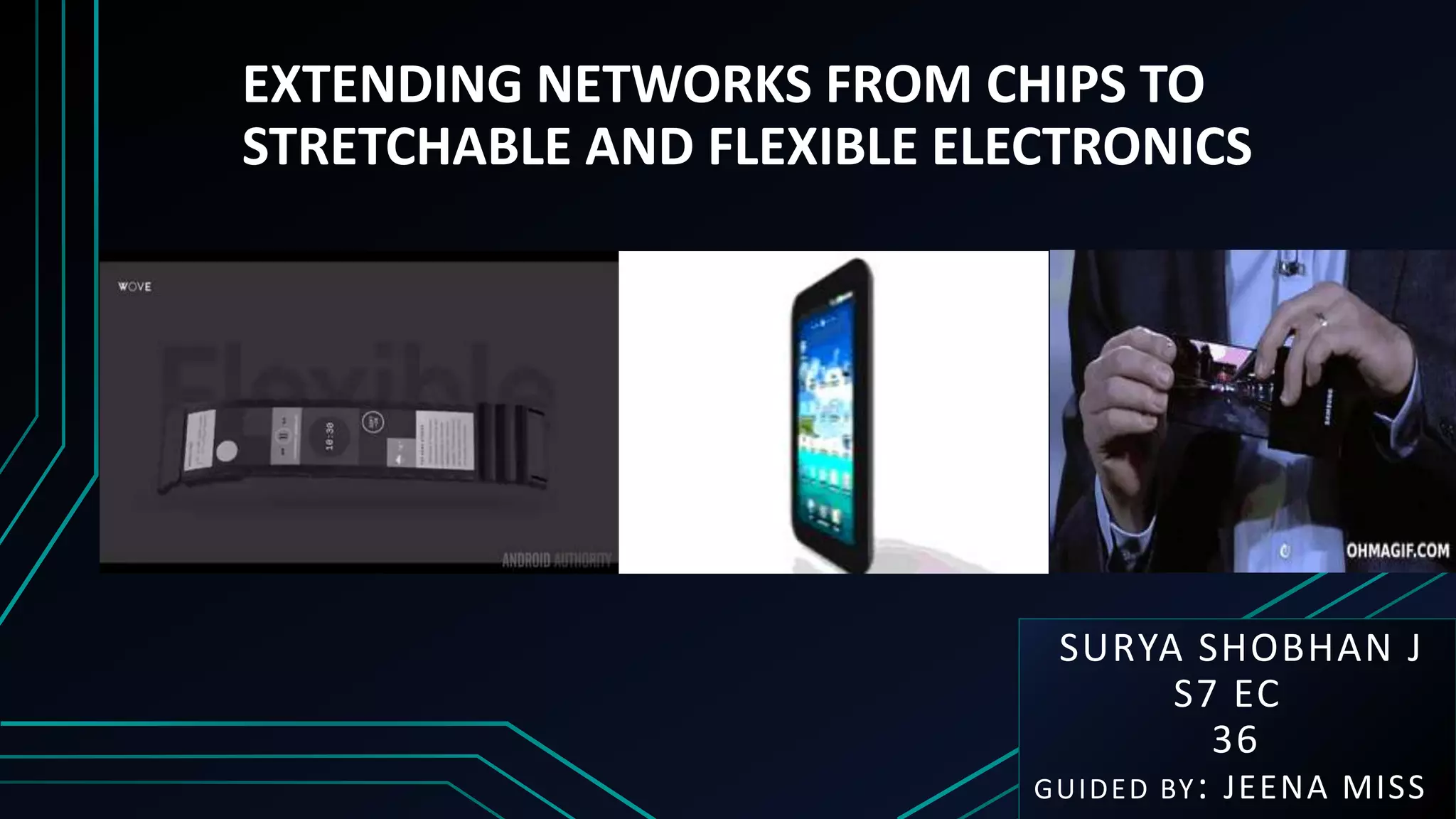 Flexible and stretchable electronics can conform to non-linear shapes and enable new form factors for computing devices. Stretchable electronics uses elastic substrates and manufacturing techniques like silicon islands or buckling mechanisms to allow stretching. Flexible electronics mounts electronic devices on flexible plastic substrates and uses roll-to-roll processing. Flexible hybrid electronics combines flexible and rigid components on flexible substrates to overcome performance limitations of purely flexible electronics. Potential applications include electronic patches and brain-machine interfaces.