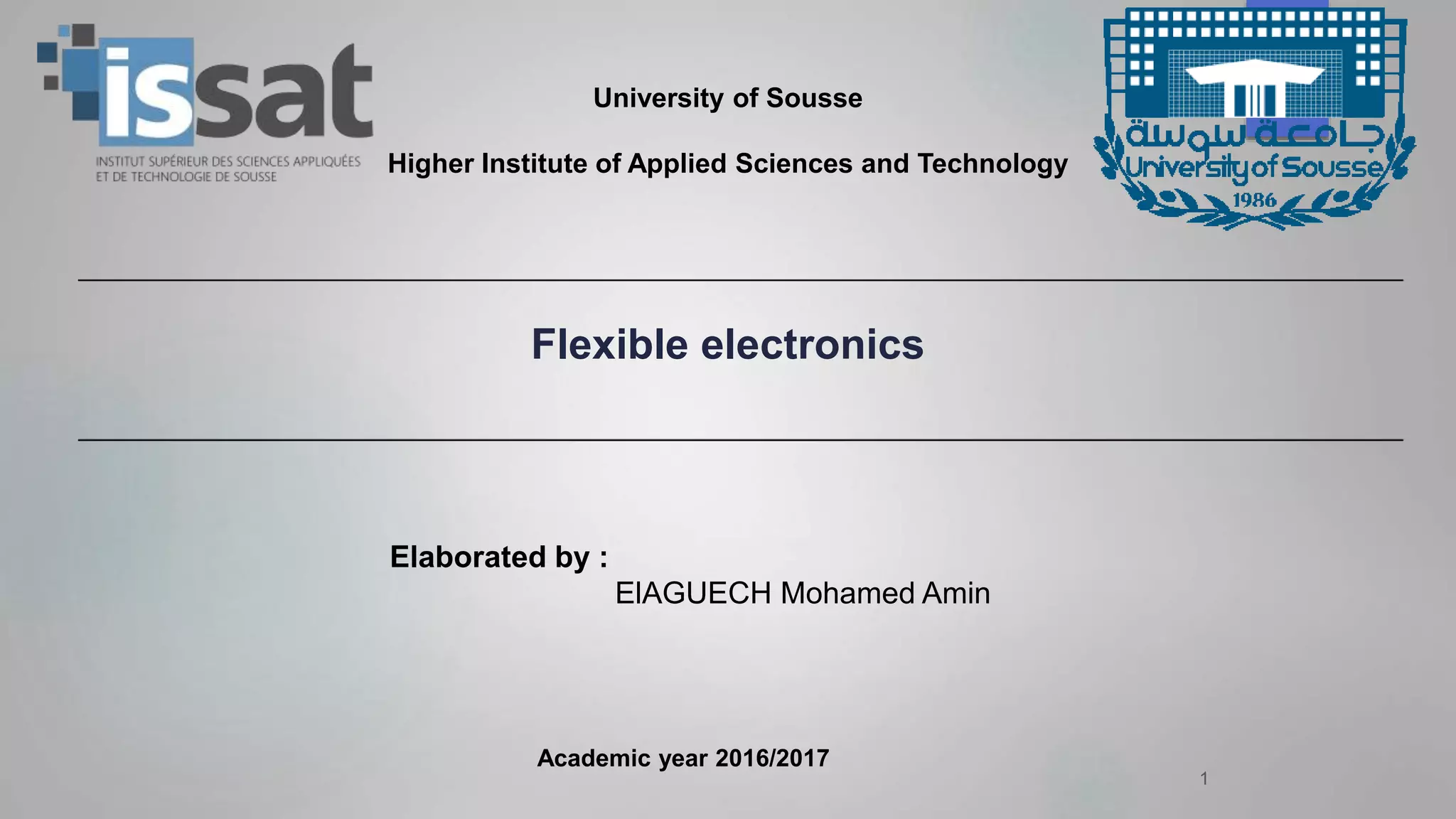 Flexible electronics is a technology where electronic circuits are assembled on flexible substrates to create devices that are thin, light, portable, and flexible. Researchers are working to develop flexible electronics in various fields. Roll-to-roll processing allows continuous fabrication of flexible devices using deposition, etching, printing, and other techniques. Applications include wearables, healthcare devices, mobile electronics, and automotive electronics. Challenges remain in improving materials, yields, lifetimes, and encapsulation of flexible electronic devices.