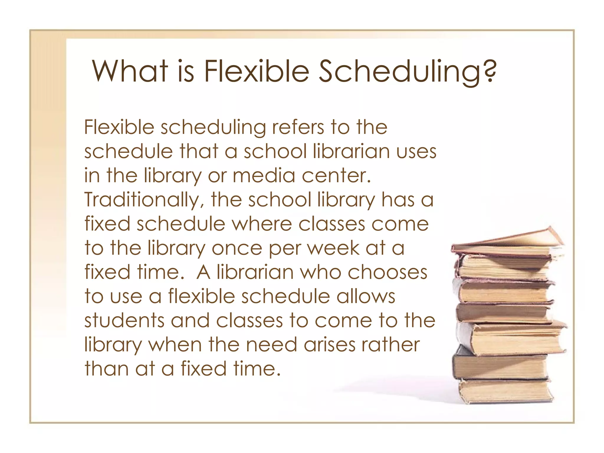 The document discusses flexible scheduling in school libraries/media centers. Flexible scheduling allows students and classes to access the library when needed rather than at fixed times. It benefits students by providing more access to resources and extending the classroom. Flexible scheduling requires collaboration between teachers and librarians to integrate information skills into lessons.