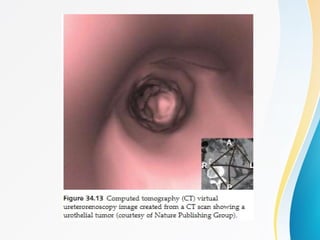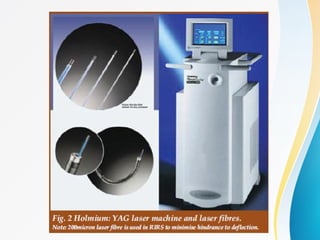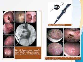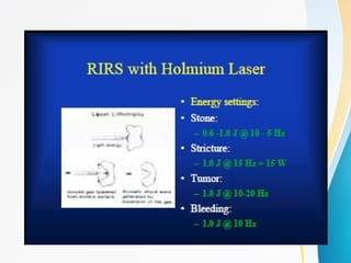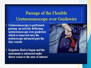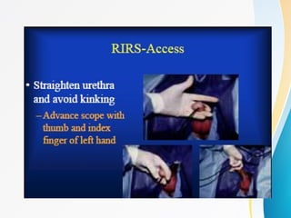 This document discusses flexible ureterorenoscopy (RIRS) for treating conditions of the kidney and urinary tract. RIRS uses flexible instruments introduced through the ureter to access the kidney in a minimally invasive manner. It has advantages over rigid ureteroscopy like shorter hospital stays and recovery time. The document outlines the history, indications, instrumentation, technique and complications of RIRS. Emerging technologies discussed include digital flexible ureteroscopy, flexible robotic assistance and virtual reconstruction of ureteroscopic views.