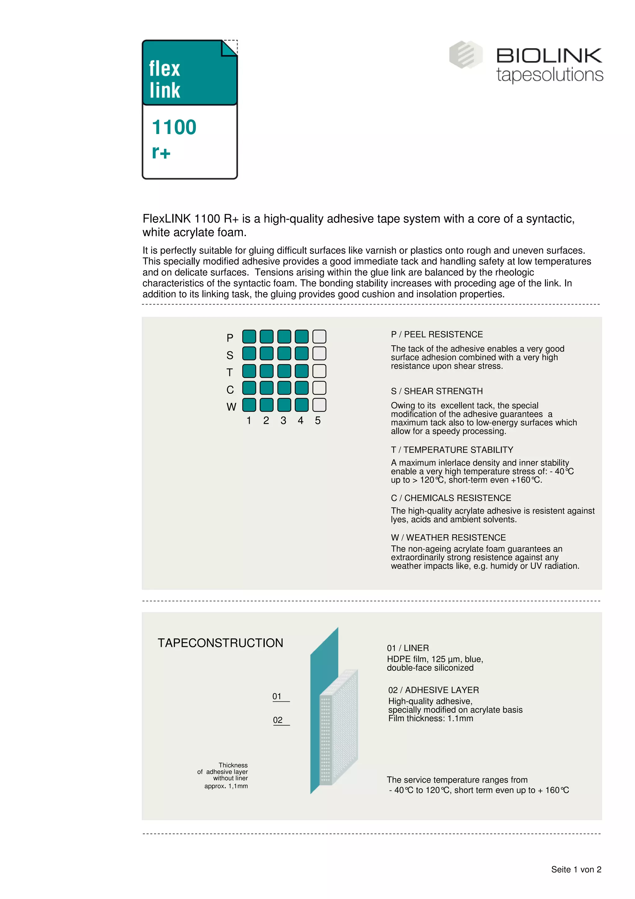The FlexLINK 1100 R+ is a high-quality adhesive tape system using a syntactic white acrylate foam core. It is suitable for bonding rough and uneven surfaces, such as varnish or plastics, and provides good initial tack even at low temperatures or on delicate surfaces. The adhesive layer is about 1.1mm thick and provides strong adhesion to metals, glass, plastics, and other surfaces, with high peel and shear strength and resistance to heat, chemicals, and weathering.