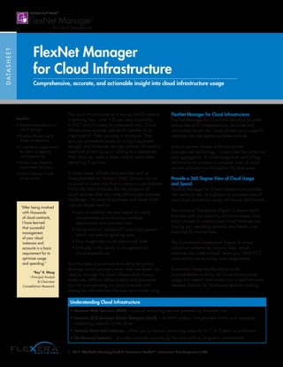 FlexNet Manager for Cloud Infrastructure provides enterprises with comprehensive visibility and optimization of their cloud infrastructure usage and spending. It aggregates data from multiple cloud accounts to provide dashboards showing total cloud spending trends, underutilized resources costing money, and usage patterns. This helps reduce expenditures, enable efficient usage, allow better budgeting and forecasting, and inhibit unauthorized "shadow IT". The tool analyzes costs and usage to determine the most cost-effective mix of cloud services and properly size resources to prevent overspending and waste. Automatic data collection and configurable reporting put relevant information in the hands of stakeholders to make effective decisions across the enterprise.