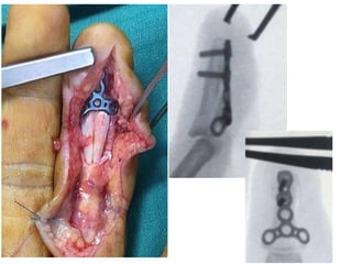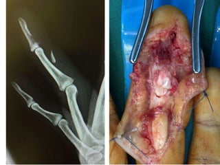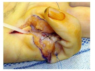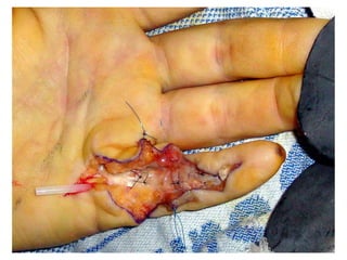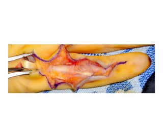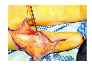 The document summarizes flexor tendon injuries and their treatment. It discusses the anatomy and biology of flexor tendons, mechanisms of tendon healing, assessment of tendon injuries including history and examination, and surgical techniques for repair. Surgical techniques discussed include primary repair, tendon grafting, and rehabilitation protocols. Positive outcomes are associated with techniques that minimize adhesion and allow early active motion, such as using biological amnion grafts and modified repair methods with pulley release.