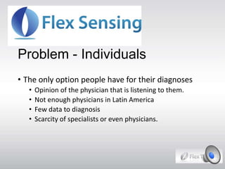 Individuals have limited options for medical diagnoses based only on a physician's opinion. There is a scarcity of specialists and physicians in Latin America. Flextracker aims to provide customized medical data and diagnoses to individuals through non-invasive sensors and collection of health metrics. This will help both individuals and corporations by providing preventative healthcare solutions, reducing treatment costs, and incentivizing healthy behaviors. Flextracker's business model involves charging annual subscription fees for basic, standard, and premium service packages to monitor individual health data for users and corporations.