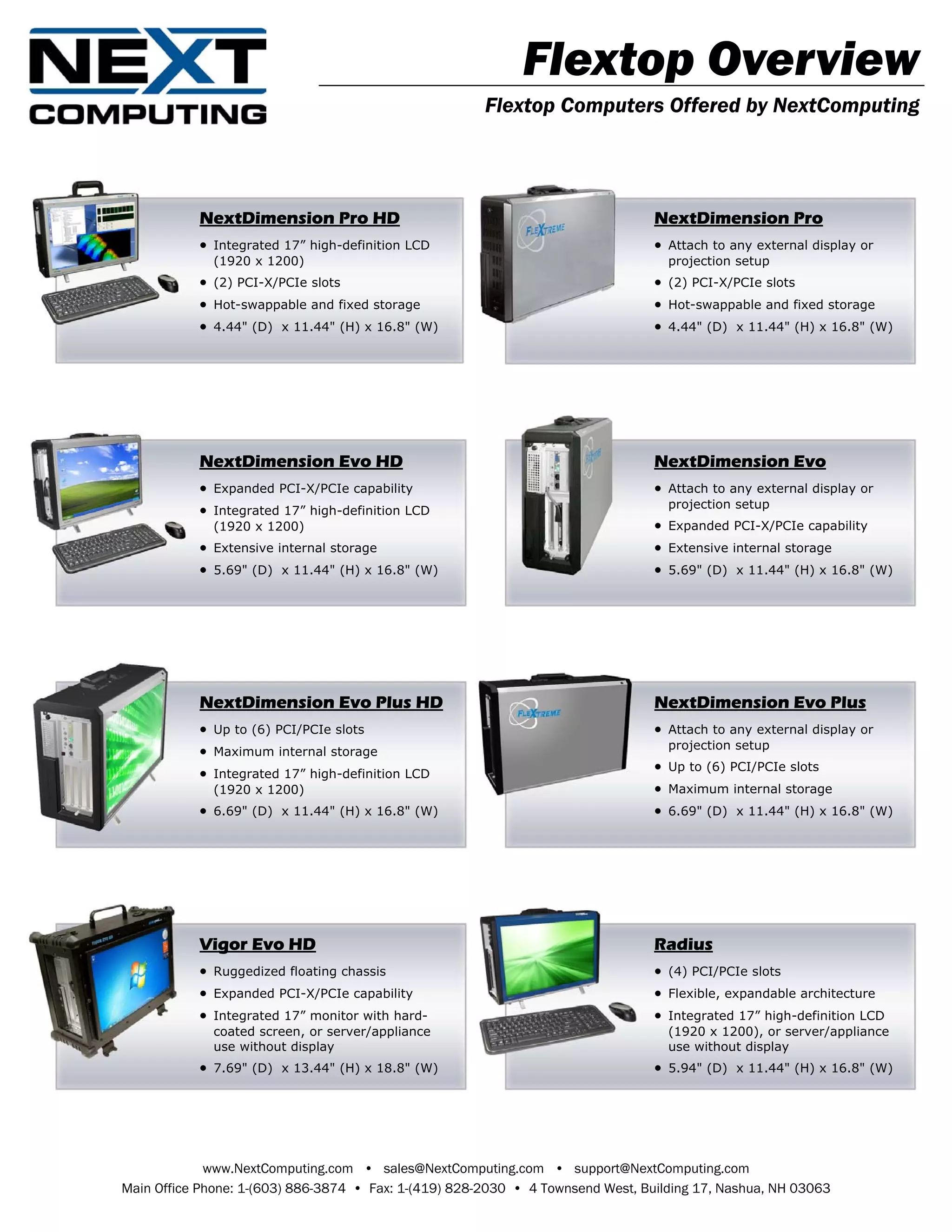 The document describes a line of portable computers called Flextops offered by NextComputing. It outlines several models in the Flextop line including the NextDimension Pro HD, NextDimension Evo HD, NextDimension Evo Plus HD, and Vigor Evo HD. The Flextops are characterized by high performance, portability, and flexible, expandable open standards architecture, combining the features of a portable, lightweight laptop with the power of a workstation or server.