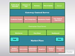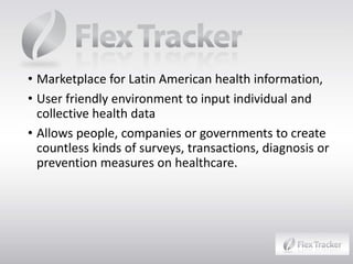 Flextracker is a marketplace designed to enhance healthcare data accessibility in Latin America by allowing individuals and corporations to input, analyze, and trade health information. The platform aims to solve issues of limited physician availability and disconnected medical data by offering subscription-based services for individuals and corporations, emphasizing data ownership and monetization. Future goals include integrating public data to support medical research and creating a synergy within the healthcare industry.