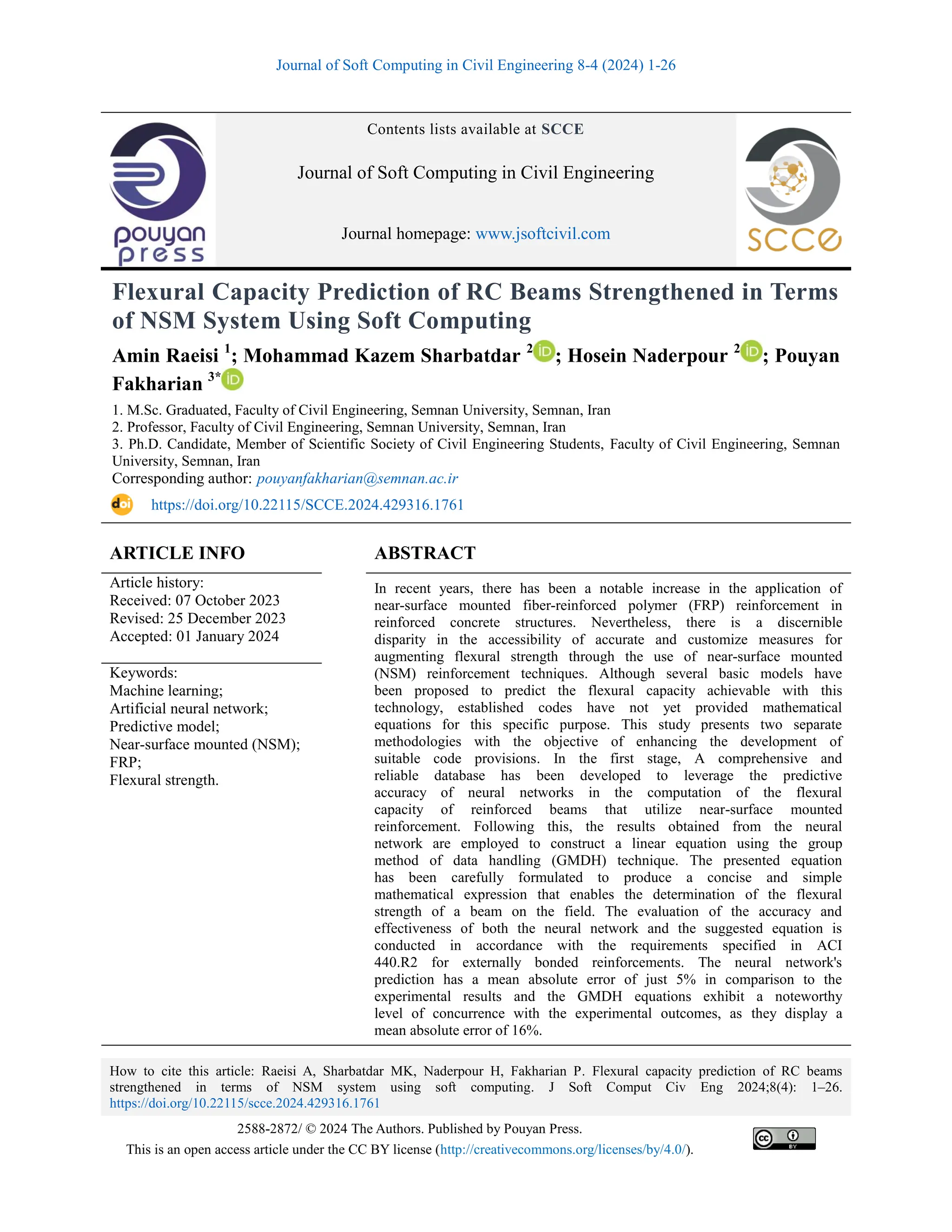 In recent years, there has been a notable increase in the application of near-surface mounted fiber-reinforced polymer (FRP) reinforcement in reinforced concrete structures. Nevertheless, there is a discernible disparity in the accessibility of accurate and customize measures for augmenting flexural strength through the use of near-surface mounted (NSM) reinforcement techniques. Although several basic models have been proposed to predict the flexural capacity achievable with this technology, established codes have not yet provided mathematical equations for this specific purpose. This study presents two separate methodologies with the objective of enhancing the development of suitable code provisions. In the first stage, A comprehensive and reliable database has been developed to leverage the predictive accuracy of neural networks in the computation of the flexural capacity of reinforced beams that utilize near-surface mounted reinforcement. Following this, the results obtained from the neural network are employed to construct a linear equation using the group method of data handling (GMDH) technique. The presented equation has been carefully formulated to produce a concise and simple mathematical expression that enables the determination of the flexural strength of a beam on the field. The evaluation of the accuracy and effectiveness of both the neural network and the suggested equation is conducted in accordance with the requirements specified in ACI 440.R2 for externally bonded reinforcements. The neural network's prediction has a mean absolute error of just 5% in comparison to the experimental results and the GMDH equations exhibit a noteworthy level of concurrence with the experimental outcomes, as they display a mean absolute error of 16%.
